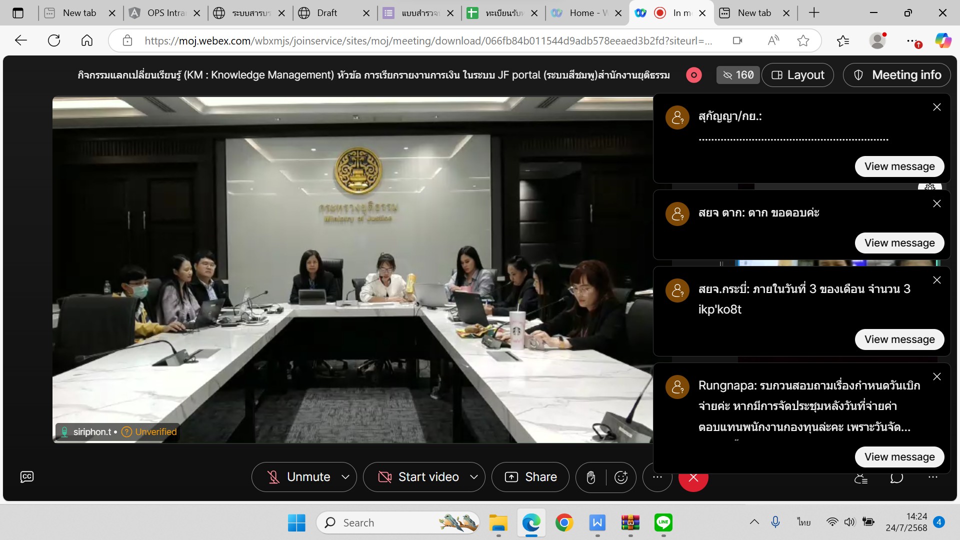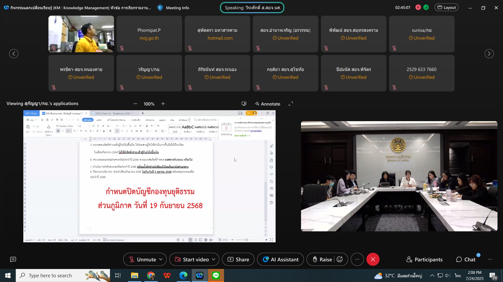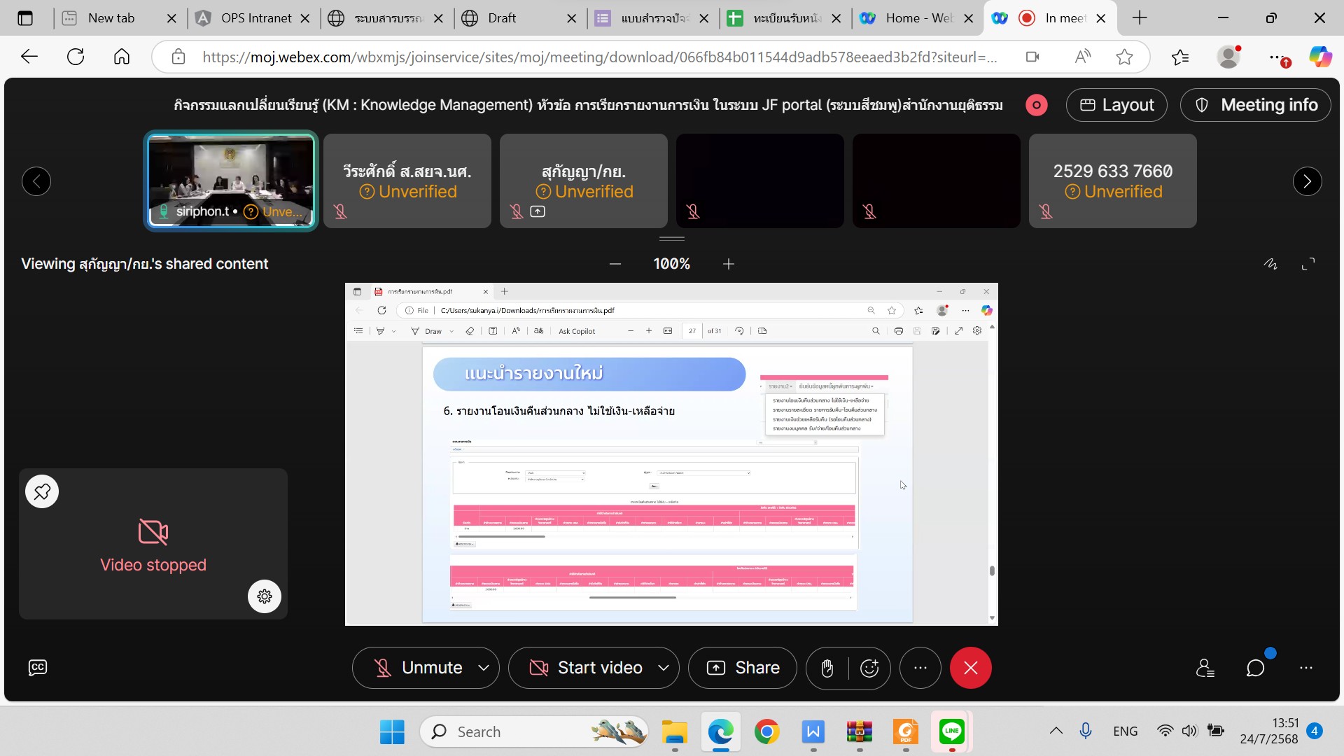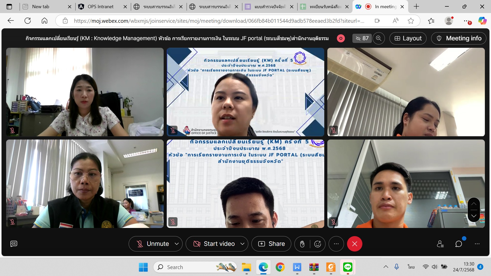 สำนักงานกองทุนยุติธรรมได้ดำเนินการจัดกิจกรรมแลกเปลี่ยนเรียนรู้ (KM : Knowledge Management) ประจำปีงบประมาณ พ.ศ. ๒๕๖๘ ครั้งที่ ๕ หัวข้อ การเรียกรายงานการเงิน ในระบบ JF portal (ระบบสีชมพู) สำนักงานยุติธรรมจังหวัด